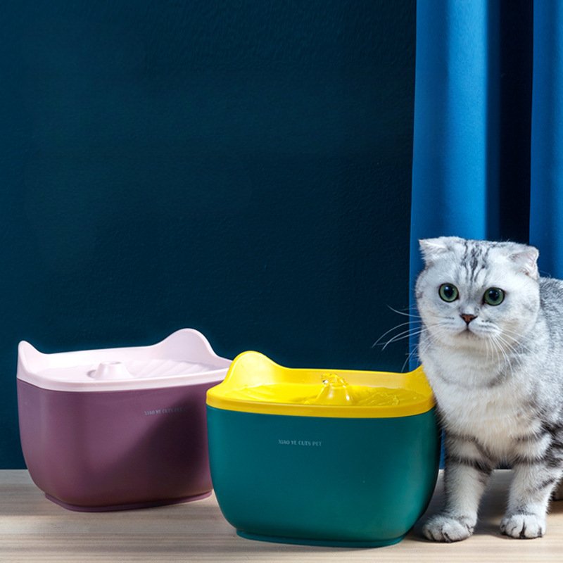 This pet water fountain comes in a cute, cat-ear-shaped design (available in purple/pink and teal/yellow color schemes), adding a playful touch to home decor. Its rounded, compact structure saves space, while the open basin (with a raised water spout) suits cats of all sizes to drink comfortably. The curved edges prevent spills, and the two-tone color matching balances aesthetics with practicality—blending seamlessly into living rooms or pet corners, ideal for daily use.